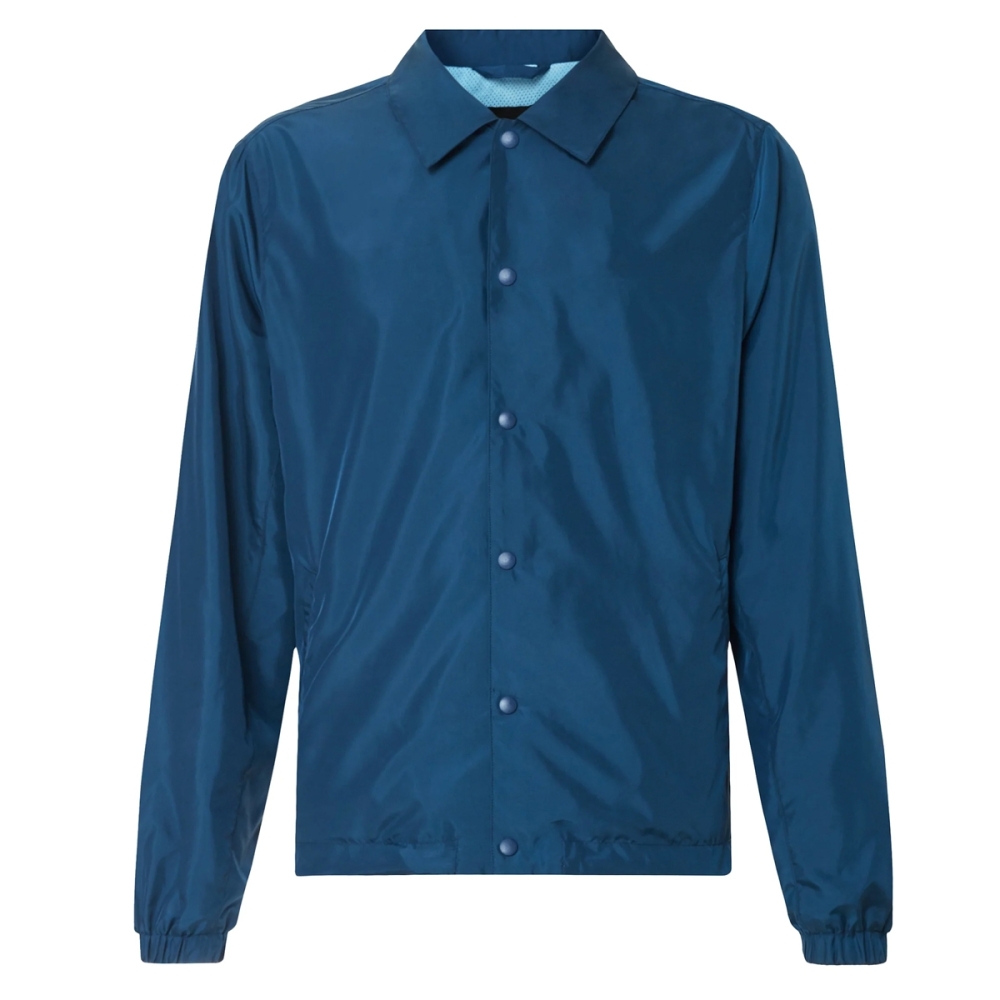This premium coach jacket features a spread collar, long sleeves, banded cuffs, two front slit pockets and a front button fastening with adjustable tabs at the waist.
